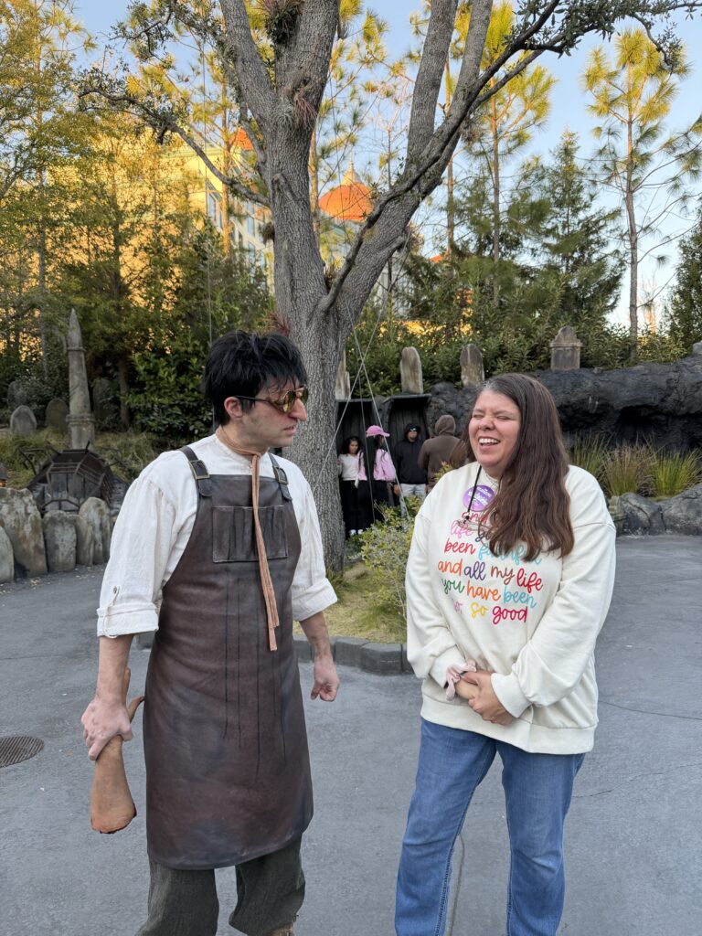 A major shift in ambiance was Dark Universe. This land is themed around classic monsters, and it brings a darker, more atmospheric vibe to the park. I even encountered some “friends.”