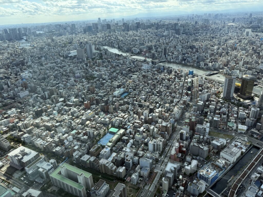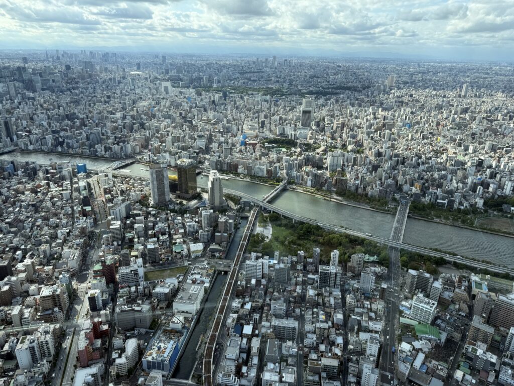 The first, the Tembo Deck at 350 meters, already feels like you’re looking out from the heavens. Through the floor-to-ceiling glass panels, Tokyo stretches in every direction, an endless sea of rooftops, highways, and green pockets of parks and temples. On clear days, you can observe Mount Fuji, but we were not fortunate to see it.